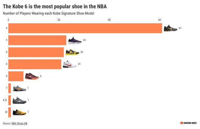而在上脚科比球鞋的136名球员中,他们上脚的具体型号分别是: